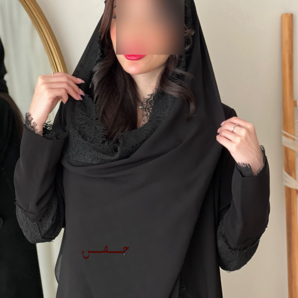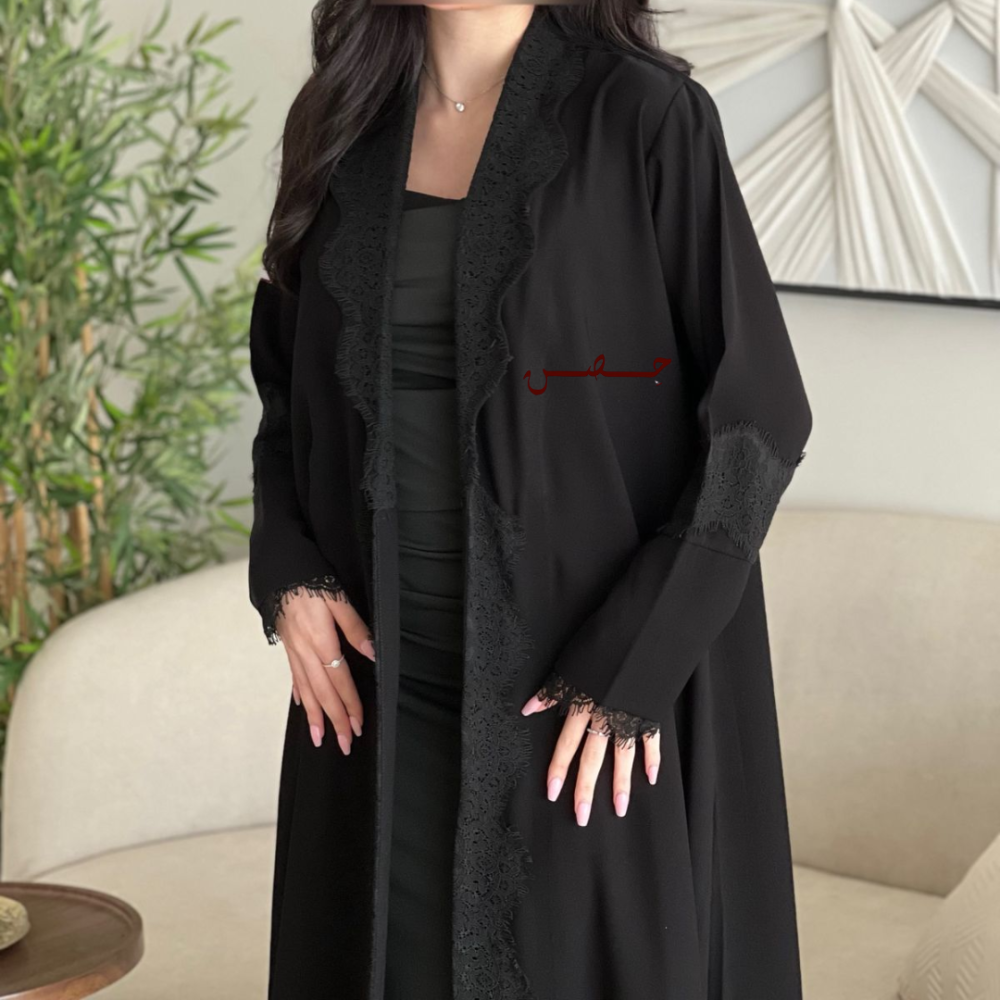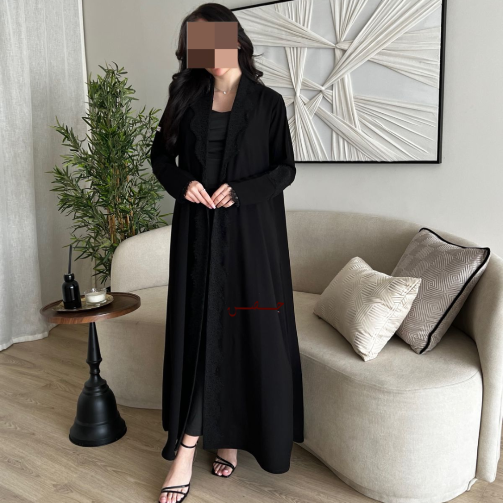 قماش دانتيل اسود متداخل مع العبايه على الياقه كامله الى الاسفل و الاكمام انيقه جداً وفخمه